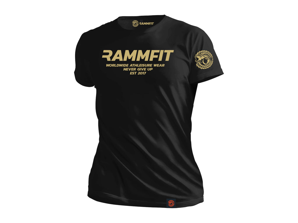 The Gold on Black Lifestyle Tee by RAMMFIT ATHLEISURE is a striking blend of elegance and edge, perfect for anyone who wants to stand out with confidence.